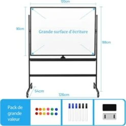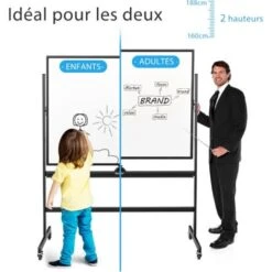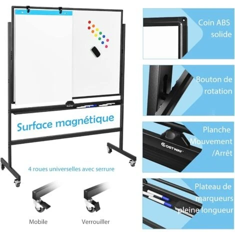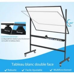 - 【Tableau double à 360°】ce tableau blanc mobile et réversible est livré avec 2 tableaux et un bouton qui permet de faire pivoter le tableau et de le verrouiller lorsque vous écrivez. Retournez le tableau d’un simple geste et notez vos idées de l’autre côté. Il sera d’une aide précieuse pour une présentation, un cours ou une formation organisée.