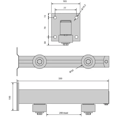 Support en acier, monté sur cages à rouleaux avec 2 olives en nylon Ø50 mm, hauteur 25 mm.