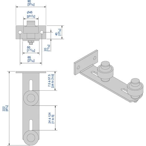 Guide réglable à visser en acier zingué pour porte coulissante extérieure avec 2 olives zytel Ø45 mm.